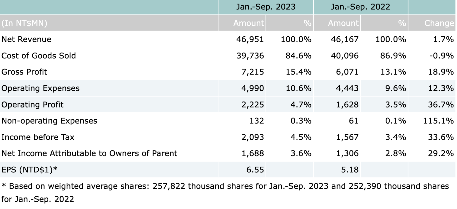 On consolidated basis, net sales for the first three quarters of year 2023 were reported as NT$46.95 billion, which represents a 2 % year-over-year increase over NT$46.17 billion for the first three quarters of year 2022. Operating profit for the first quarters were NT$2,225 million, which represents a 37 % year-over-year increase over NT$1,628 million for the first three quarters of year 2022. Net income attributable to owners of parent for the first three quarters of 2023 were NT$1,688 million, which represents a 29 % increase compared to NT$1,306 million for the same period of last year. Based on 258 million weighted average shares, earnings per share (EPS) for the first three quarters of year 2023 were reported as NT$6.55.