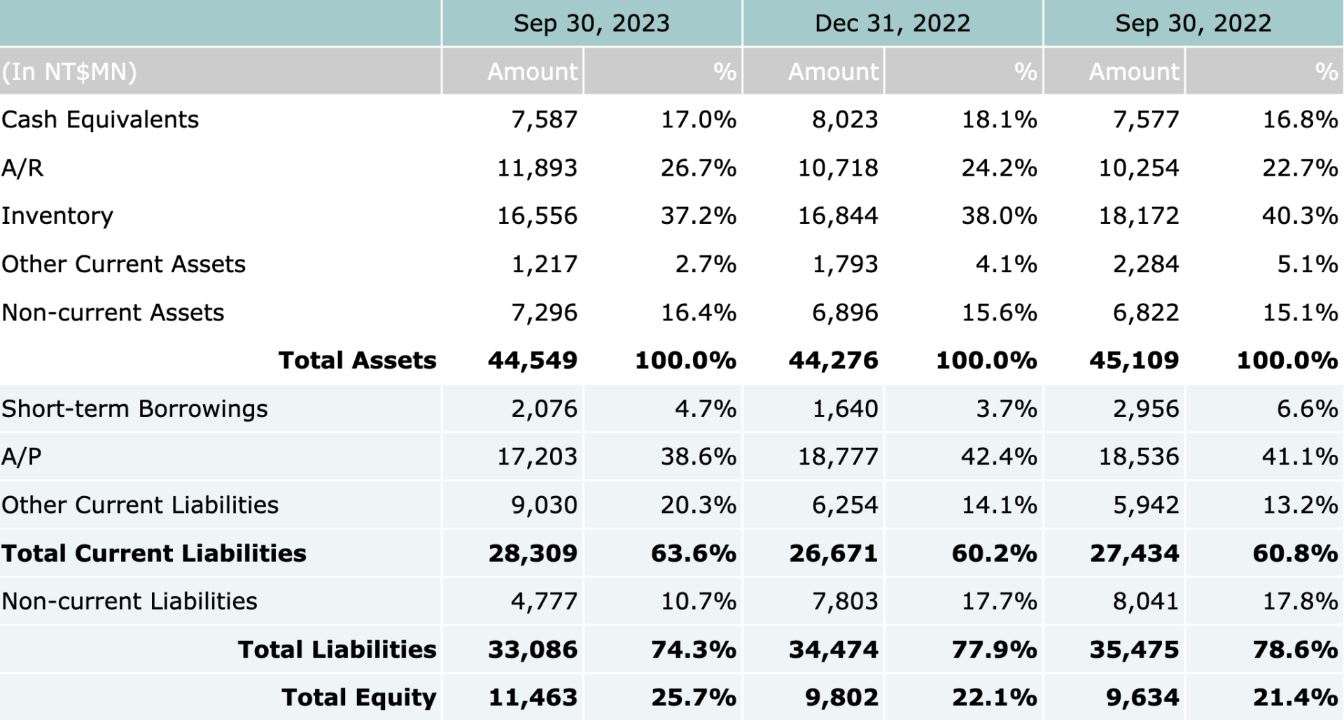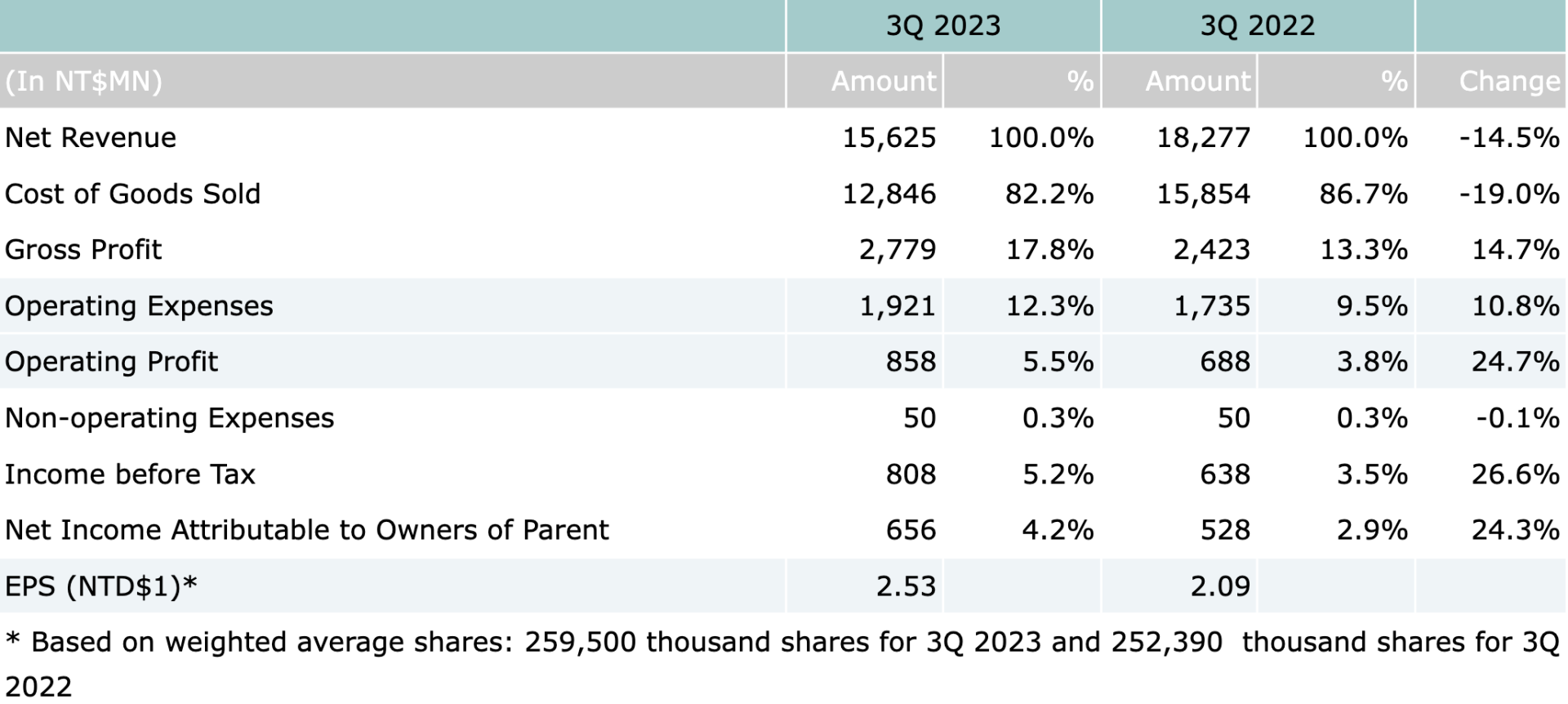 Consolidated net sales for the third quarter of year 2023 were NT$15.63 billion, which represents a 14.5% year-over-year decrease compared to NT$18.28 billion for 3Q 2022. Operating profit for 3Q’23 was $858 million, which represents a 25 % year-over-year increase over NT$688 million for the third quarter of year 2022. Net income attributable to owners of parent for 3Q’23 was NT$656 million, which represents a 24 % increase compared to NT$528 million for the 3Q 2022. Based on 260 million weighted average shares, EPS were reported as NT$2.53 for the third quarter of year 2023.