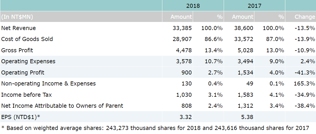 Consolidated net sales for 2018 were reported as NT$33.39 billion, which represents a 14% decrease over NT$38.6 billion for year 2017.