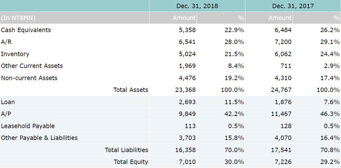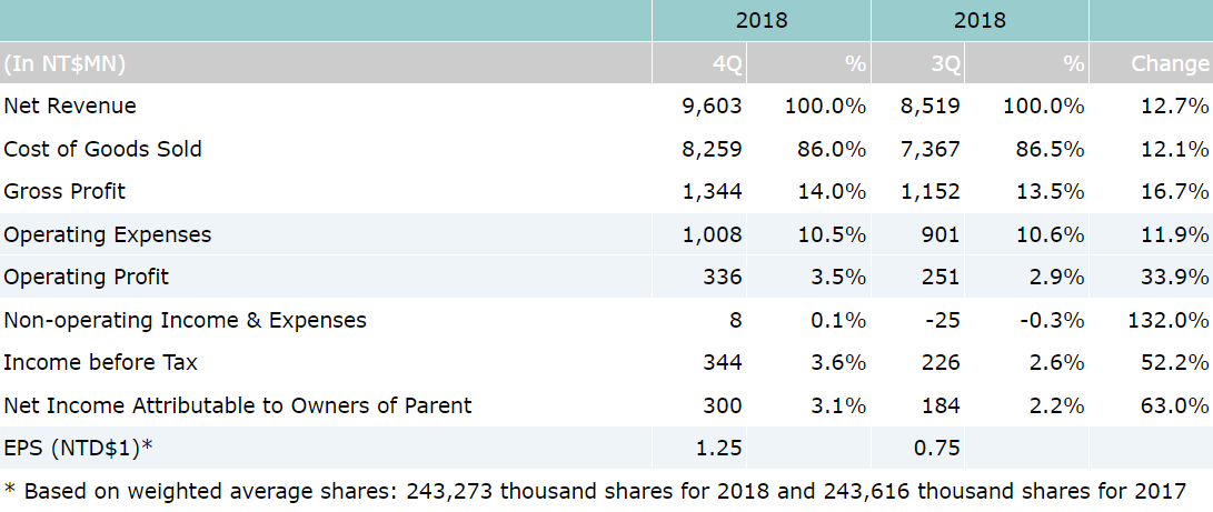 On consolidated basis, net sales for the fourth quarter of year 2018 were NT$9.6 billion, which represents a 13% increase compared to NT$8.52 billion for the third quarter of year 2018. Operating profit for 4Q’18 were NT$336 million, which represents a 34% quarter-over-quarter increase over NT$251 million for 3Q’18. Net income attributable to owners of parent for 4Q’18 were NT$300 million, which also represents a 63% increase compared to NT$184 million for 3Q’18. Based on 243 million weighted average shares, EPS were reported as NT$1.25 for the 4th quarter of year 2018.