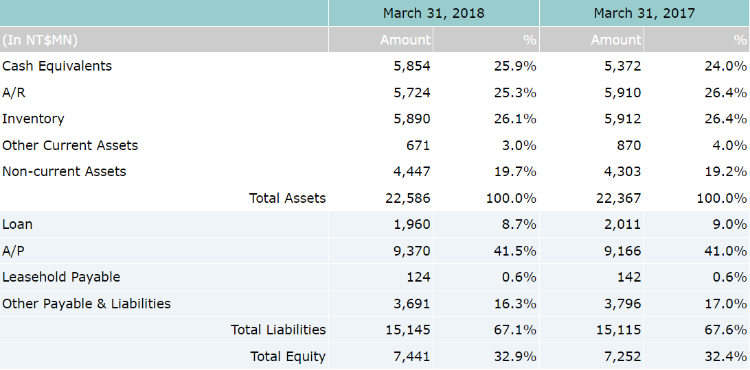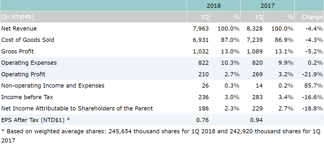 On consolidated basis, net sales for the first quarter of year 2018 was NT$7.96 billion, which represents a 4.4% decrease over NT$8.33 billion for 1Q'17. Gross profit for the first quarter of 2018 was $1.03 billion with 13% gross margin. Income before tax and net income attributable to shareholders of the parent for 1Q’18 was NT$236 million and NT$186 million, respectively. Based on 246 million weighted average shares, earnings per share (EPS) were reported as NT$0.76 for the 1st quarter of 2018.