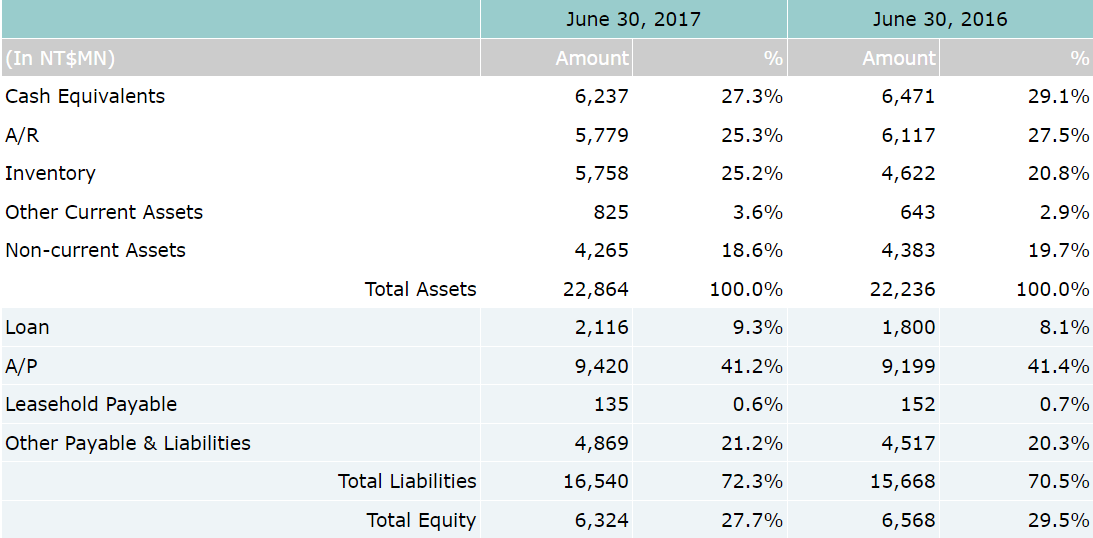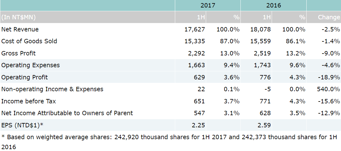 Consolidated net sales for the first half of year 2017 were reported as NT$17.63 billion, which represents a 2.5% decrease over NT$18.08 billion for the first half of year 2017. Operating profit and net income attributable to owners of parent for 1H’17 were NT$629 million and NT$547 million, respectively. Based on 243 million weighted average shares, earnings per share (EPS) for the first half of year 2017 were reported as NT$2.25.
