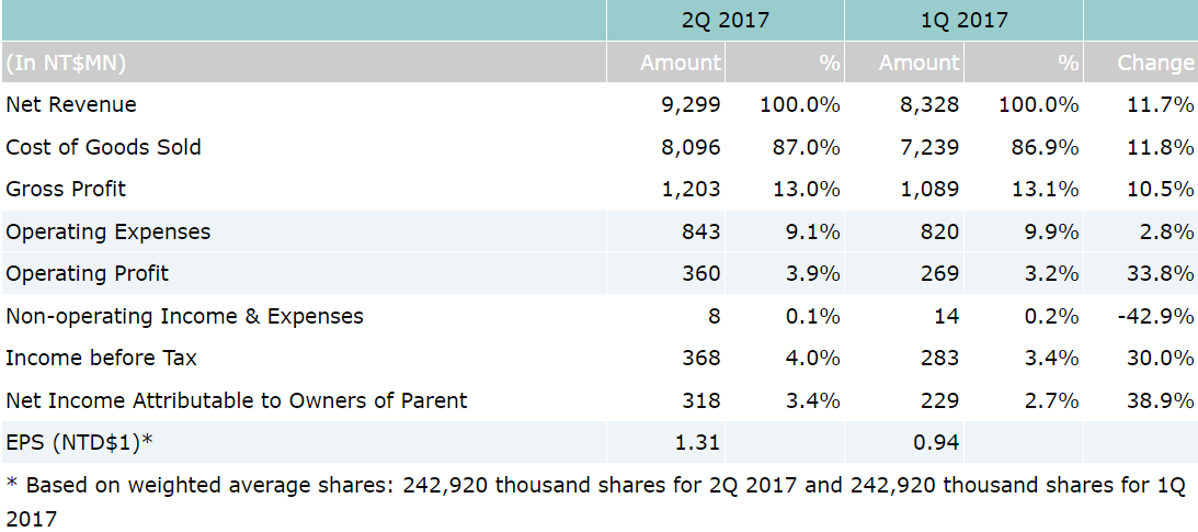 On consolidated basis, net sales for the second quarter of year 2017 were NT$9.3 billion, which represents an 11.7% increase compared to NT$8.33 billion for 1Q 2017. Operating profit for 2Q 2017 were NT$360 million, which represents a 33.8% year-over-year increase compared to NT$269 million for the first quarter of year 2017. Net income attributable to owners of parent for 2Q’17 were NT$318 million, which also represents a 38.9% increase over NT$229 million for 1Q’17. Based on 243 million weighted average shares, EPS were reported as NT$1.31 for the 2nd quarter of year 2017.