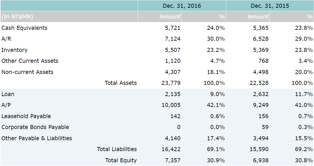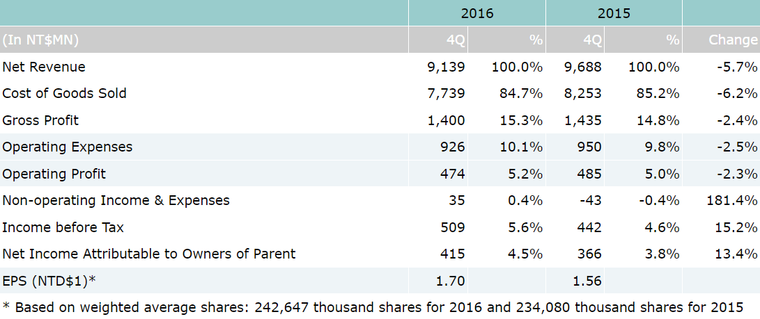 Consolidated net sales for the fourth quarter of year 2016 were NT$9.14 billion, which represents a 6% decrease compared to NT$9.69 billion for the fourth quarter of year 2015. Operating profit for 4Q’16 were NT$474 million, which represents a 2% year-over-year decrease over NT$485 million for 4Q’15. Net income attributable to owners of parent for 4Q’16 were NT$415 million, which also represents a 13% increase compared to NT$366 million for 4Q’15. Based on 243 million weighted average shares, EPS were reported as NT$1.7 for the 4th quarter of year 2016.