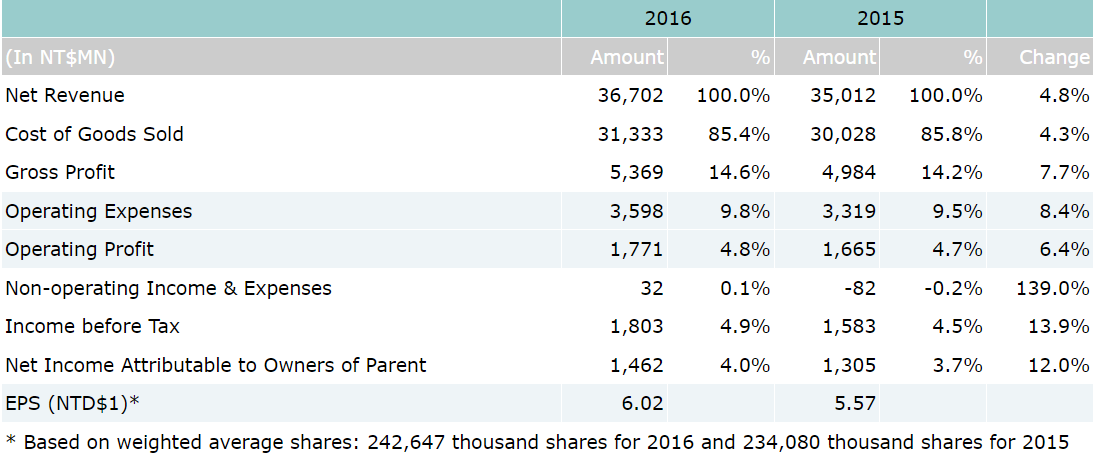 On consolidated basis, net sales for 2016 were reported as NT$36.7 billion, which represents a 5% increase over NT$35.01 billion for year 2015. Operating profit for 2016 were NT$1.77 billion, which represents a 6% year-over-year increase over NT$1.67 billion for 2015. Net income attributable to owners of parent for 2016 were NT$1.46 billion, which also represents a 12% increase compared to NT$1.31 billion for 2015. Based on 243 million weighted average shares, earnings per share (EPS) for year 2016 were reported as NT$6.02.