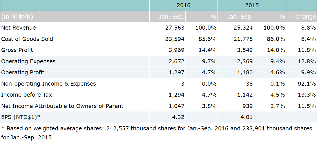 On consolidated basis, net sales from January to September of year 2016 were reported as NT$27.56 billion, which represents a 9% increase over NT$25.32 billion for the first three quarters of 2015. Operating profit for the first three quarters of 2016 were NT$1.3 billion, which represents a 10% year-over-year increase over NT$1.18 billion for the same period last year. Net income attributable to owners of parent from January to September of year 2016 were NT$1,047 million, which also represents a 12% increase compared to NT$939 million for the same period last year. Based on 243 million weighted average shares, earnings per share (EPS) for the first three quarters of year 2016 were reported as NT$4.32.
