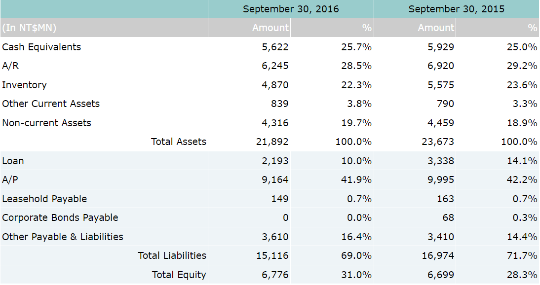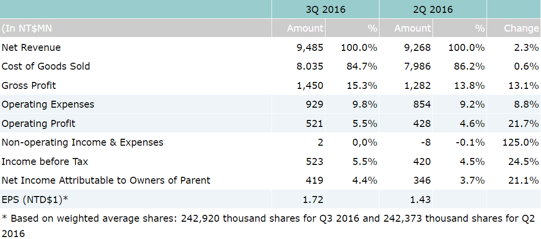 Consolidated net sales for the third quarter of year 2016 were NT$9.49 billion, which represents a 2% increase compared to NT$9.27 billion for 2Q’16. Operating profit for 3Q’16 were NT$521 million, which represents a 22% quarter-over-quarter increase over NT$428 million for the second quarter of year 2016. Net income attributable to owners of parent for 3Q’16 were NT$419 million, which also represents a 21% increase compared to NT$346 million for the 2Q 2016. Based on 243 million weighted average shares, EPS were reported as NT$1.72 for the 3rd quarter of year 2016.
