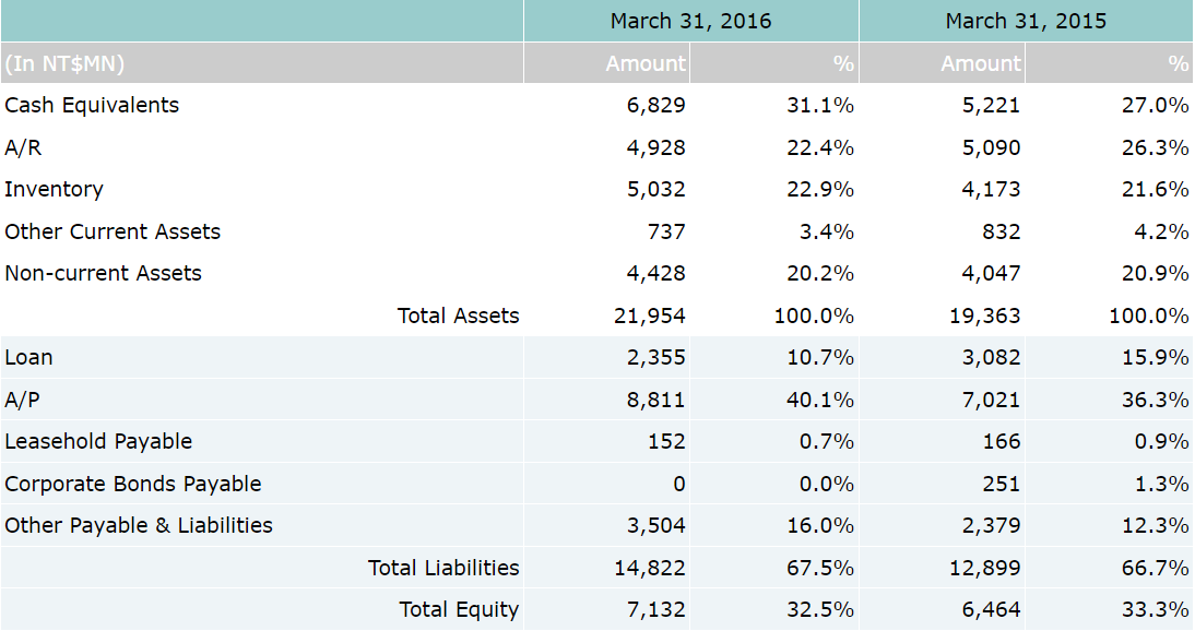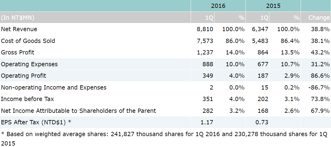 On consolidated basis, net sales for the first quarter of year 2016 were NT$8.81 billion, which represents a 39% increase over NT$6.35 billion for 1Q'15. Operating profit for 1Q 2016 were NT$349 million which represents an 87% year-over-year increase over NT$187 million for 1Q’15. Income before tax were NT$351 million and net income attributable to shareholders of the parent were NT$282 million for 1Q’16, which also represent 74% and 68% year-over-year increase respectively.