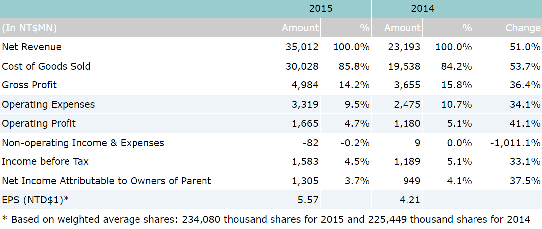 On consolidated basis, net sales for 2015 were reported as NT$35.01 billion, which represents a 51% increase over NT$23.19 billion for year 2014. Operating profit for 2015 were NT$1.67 billion, which represents a 41% year-over-year increase over NT$1.18 billion for 2014. Net income attributable to owners of parent for 2015 were NT$1.31 billion, which also represents a 38% increase compared to NT$949 million for 2014. Based on 234 million weighted average shares, earnings per share (EPS) for year 2015 were reported as NT$5.57.