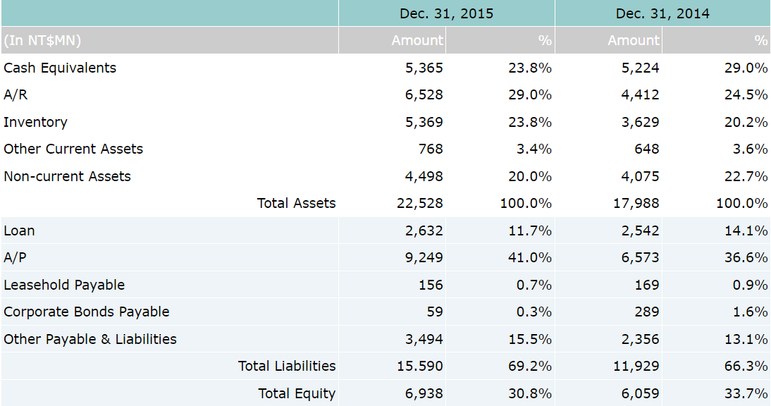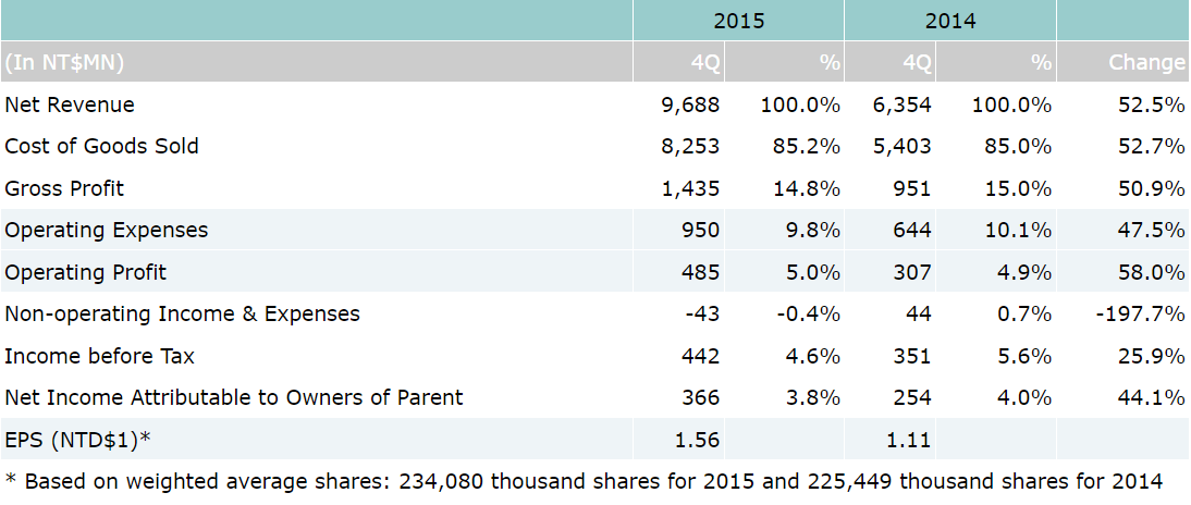 Consolidated net sales for the fourth quarter of year 2015 were NT$9.69 billion, which represents a 53% increase compared to NT$6.35 billion for the fourth quarter of year 2014. Operating profit for 4Q’15 were NT$485 million, which represents a 58% year-over-year increase over NT$307 million for 4Q’14. Net income attributable to owners of parent for 4Q’15 were NT$366 million, which also represents a 44% increase compared to NT$254 million for 4Q’14. Based on 234 million weighted average shares, EPS were reported as NT$1.56 for the 4th quarter of year 2015.