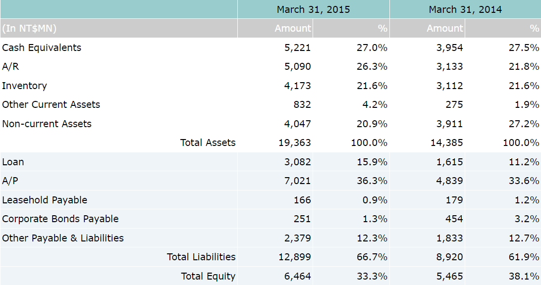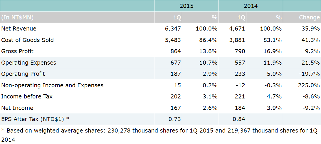 On consolidated basis, net sales for the first quarter of year 2015 were NT$6.35 billion, which represents a 35.9% increase over NT$4.67 billion for 1Q'14. Income before tax and net income for 1Q 2015 were NT$202 million and NT$167 million, respectively. Based on 230 million weighted average shares, earnings per share (EPS) were reported as NT$0.73 for the 1st quarter of 2015.