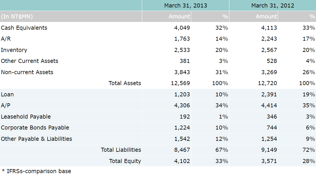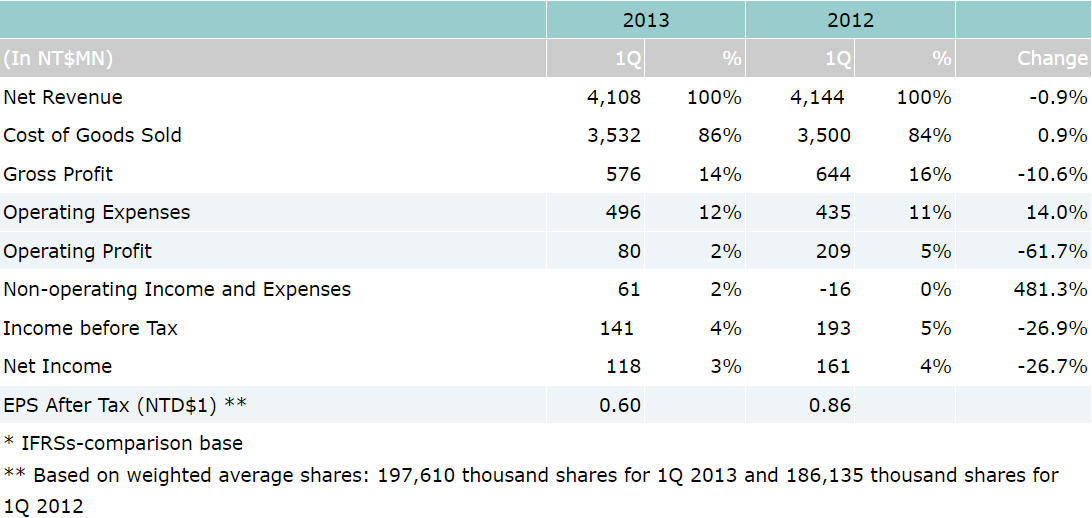 On consolidated basis, net sales for the first quarter of year 2013 were NT$4.11 billion, which represents a 0.9% decrease over NT$4.14 billion for 1Q'12. Income before tax and net income for 1Q 2013 were NT$141 million and NT$118 million, respectively. Based on 197.61 million weighted average shares, earnings per share (EPS) were reported as NT$0.6 for the 1st quarter of 2013.