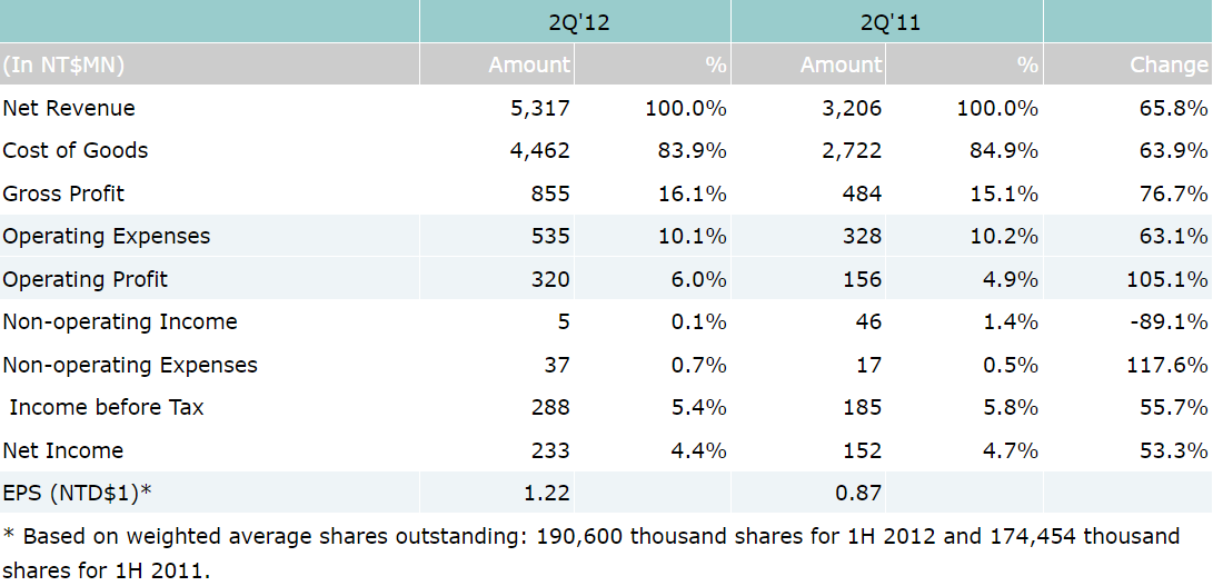 Consolidated net sales for the 2nd quarter of year 2012 were NT$5.32 billion, which represents a 66% increase compared to NT$3.21 billion for 2Q’11. Income before tax for 2Q’12 were NT$288 million, which represents a 56% year-over-year increase over NT$185 million for the second quarter of year 2011. Net income for 2Q’12 were NT$233 million, which also represents a 53% increase compared to NT$152 million for the same period last year. Based on 191 million weighted average shares outstanding, EPS were reported as NT$1.22 for the second quarter of year 2012.