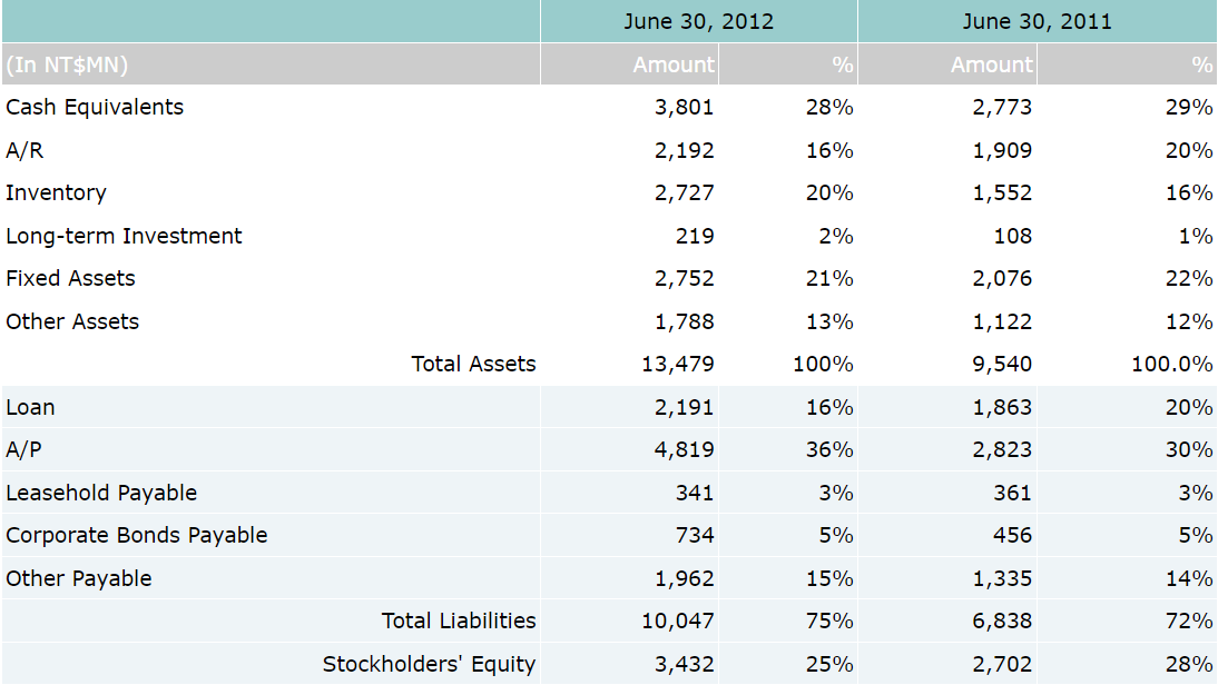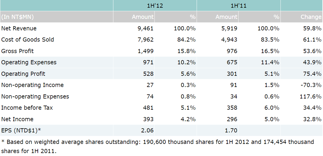 On consolidated basis, net sales for the first half of year 2012 were reported as NT$9.46 billion, which represents a 60% increase over NT$5.92 billion for the first half of year 2011. Income before tax for 1H'12 were NT$481 million, which represents a 34% year-over-year increase over NT$358 million for the same period last year. Net income for 1H’12 were NT$393 million, which also represents a 33% increase compared to NT$296 million for the 1st half of 2011. Based on 191 million weighted average shares outstanding, earnings per share (EPS) for the first half of year 2012 were reported as NT$2.06.