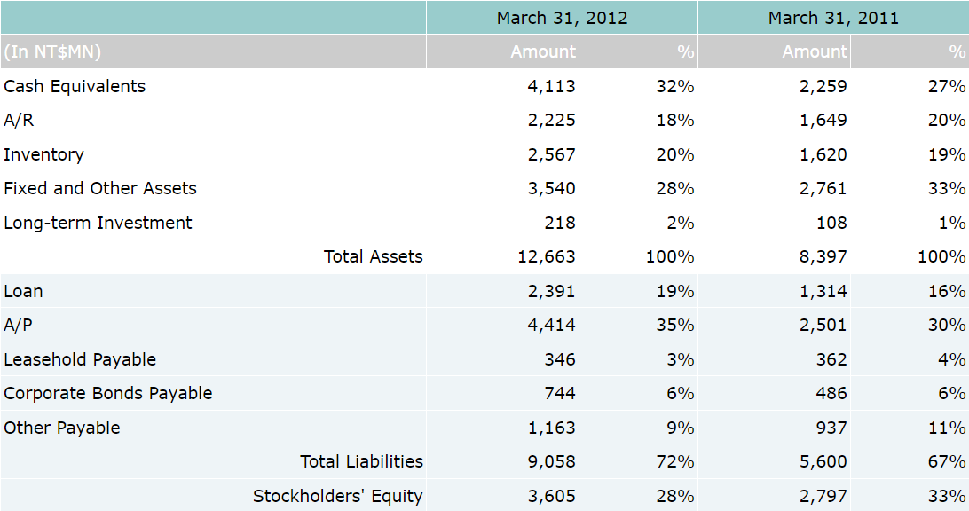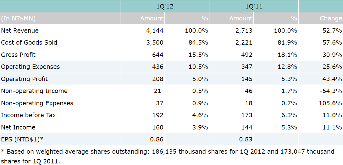 On consolidated basis, net sales for the 1st quarter of year 2012 were NT$4.14 billion, which represents a 52.7% increase compared to NT$2.71 billion for 1Q’11. Operating Profit for 1Q’12 were NT$208 million, which represents a 43.4% year-over-year increase over NT$145 million for the first quarter of year 2011. Net income for 1Q’12 were NT$160 million, which also represents a 11.1% increase compared to NT$144 million for the same period last year. Based on 186 million weighted average shares outstanding, earnings per share (EPS) were reported as NT$0.86 for the first quarter of year 2012.