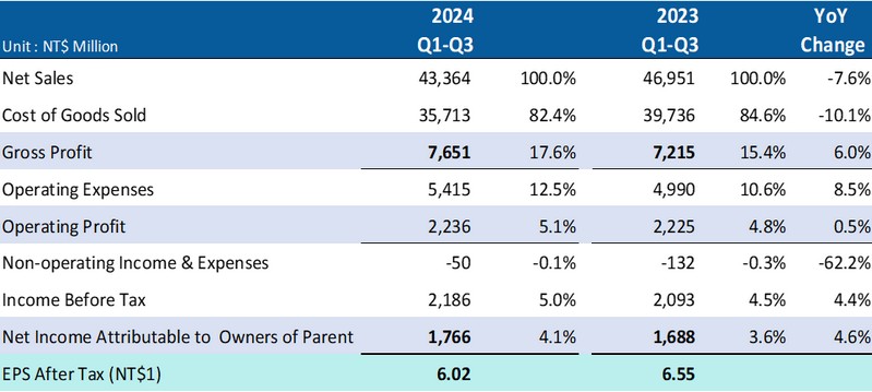 On consolidated basis, net sales for the first three quarters of the year 2024 were reported as NT$43.36 billion, which represents a 7.6 % year-over-year decrease over NT$46.95 billion for the first three quarters of the year 2023. Operating profit for the first three quarters of the year 2024 were NT$2,235.5 million, which represents a 0.5 % year-over-year increase over NT$2,224.6 million for the first three quarters of the year 2023. Net income attributable to owners of parent for the first three quarters of the year 2024 were NT$1,765.6 million, which represents a 4.6 % increase compared to NT$1,688.2 million for the same period of last year. Based on 293 million weighted average shares, earnings per share (EPS) for the first three quarters of the year 2024 were reported as NT$6.02.