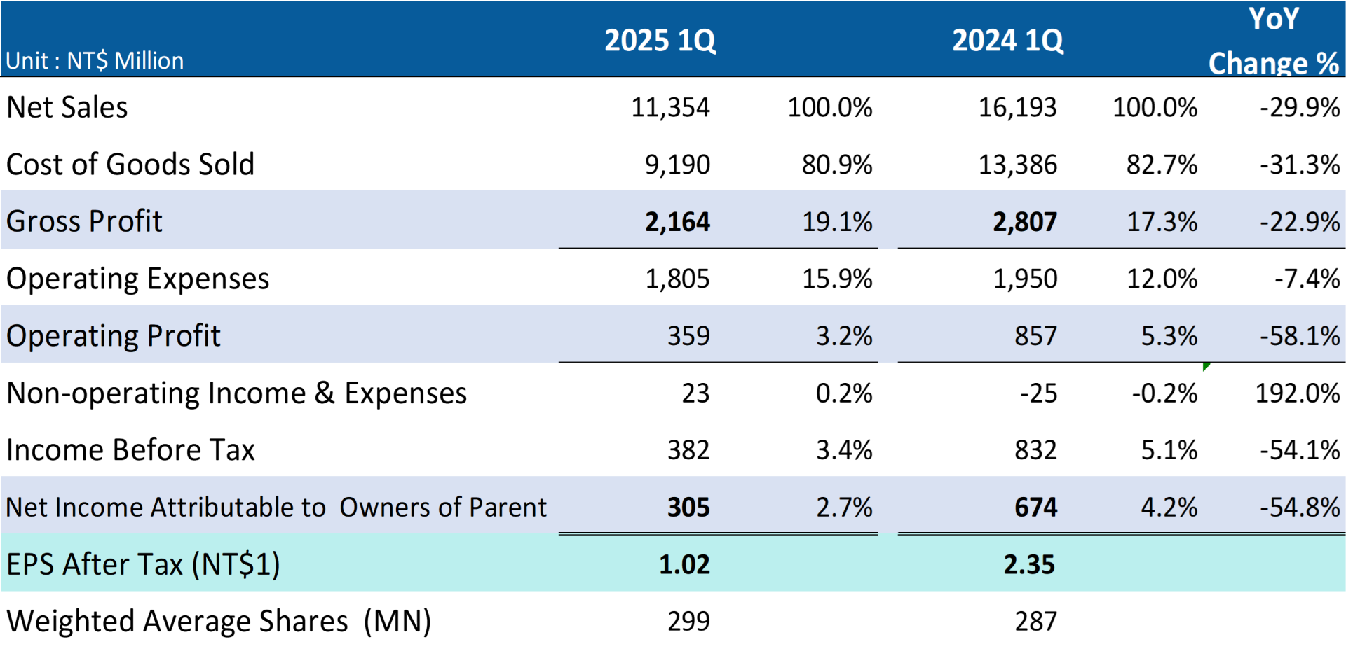 Consolidated net sales for the first quarter of year 2025 were NT$11.4 billion, which represents a 30% year-over-year decrease compared to NT$16.2 billion for 1Q 2024. Operating profit for 1Q’25 was NT$359 million, which represents a 58% year-over-year decrease over NT$857 million for the first quarter of year 2024. Net income attributable to owners of parent for 1Q’25 was NT$305 million, which represents a 55 % decrease compared to NT$674 million for the 1Q 2024. Based on 298.6 million weighted average shares, EPS were reported as NT$1.02 for the first quarter of year 2025.