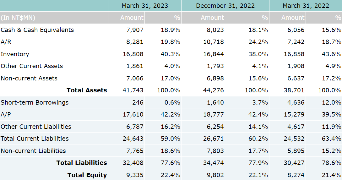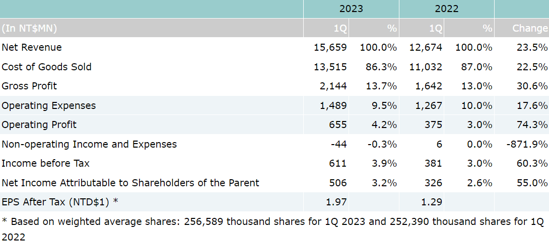 On consolidated basis, net revenue for the first quarter of year 2023 was NT$15.66 billion, which represents a 24% increase over NT$12.67 billion for the first quarter of year 2022. Operating profit was NT$655 million, which represents a 74% year-over-year increase compared to NT$375 million for the same period last year. Net income attributable to owners of the parent for was NT$506 million, which represents a 55% increase compared to NT$326 million for the same period last year. Based on 257 million weighted average shares, earnings per share (EPS) was reported as NT$1.97 for the 1st quarter of year 2023.
