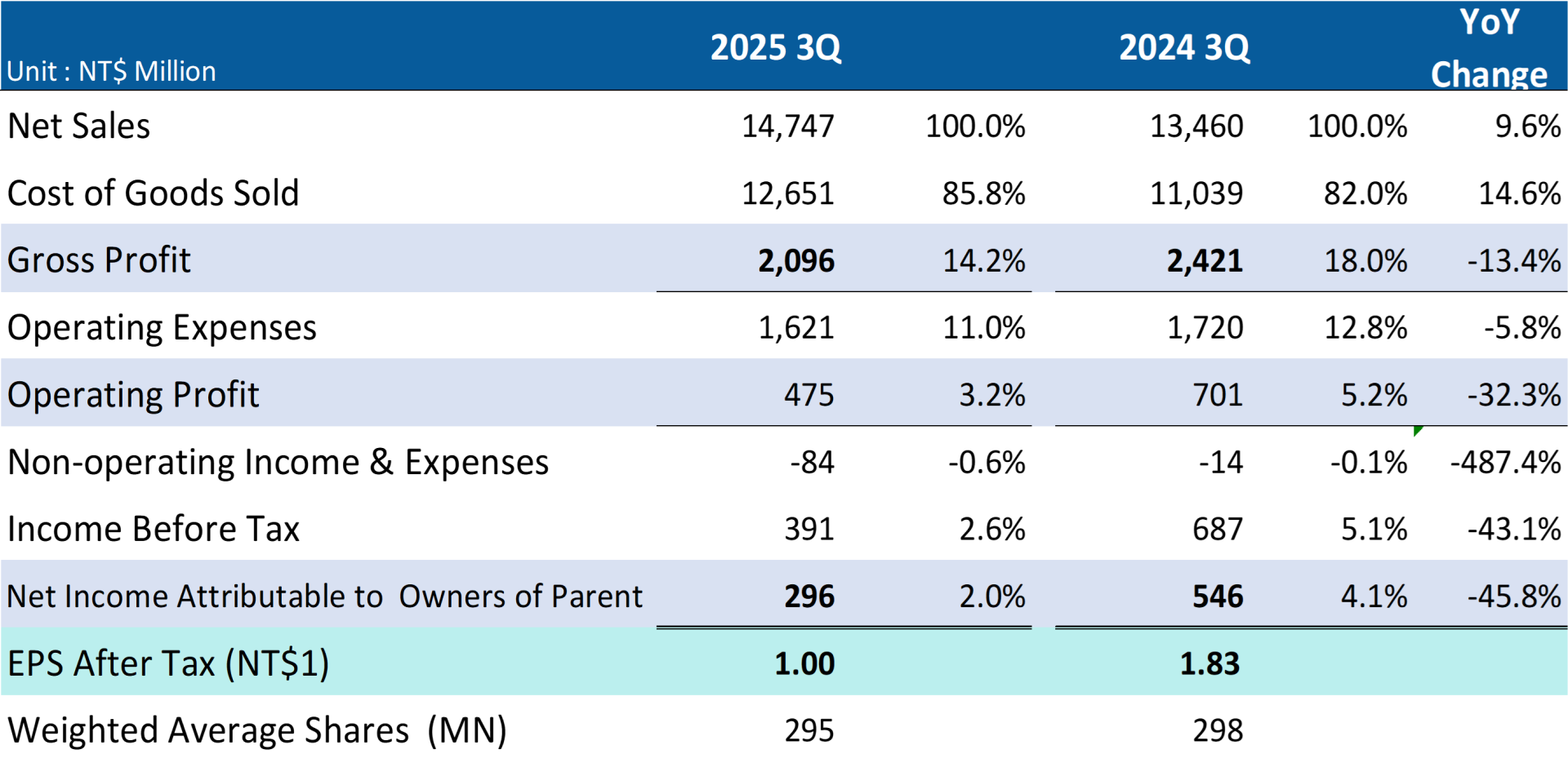 Consolidated net sales for the third quarter of year 2025 were NT$14.7 billion, which represents a 9.6% year-over-year increase compared to NT$13.5 billion for 3Q 2024. Operating profit for 3Q’25 was NT$475.4 million, which represents a 32.3% year-over-year decrease over NT$701.5 million for the third quarter of year 2024. Net income attributable to owners of parent for 3Q’25 was NT$296.3 million, which represents a 45.8 % decrease compared to NT$546.1 million for the 3Q 2024. Based on 295 million weighted average shares, EPS were reported as NT$1.00 for the third quarter of year 2025.