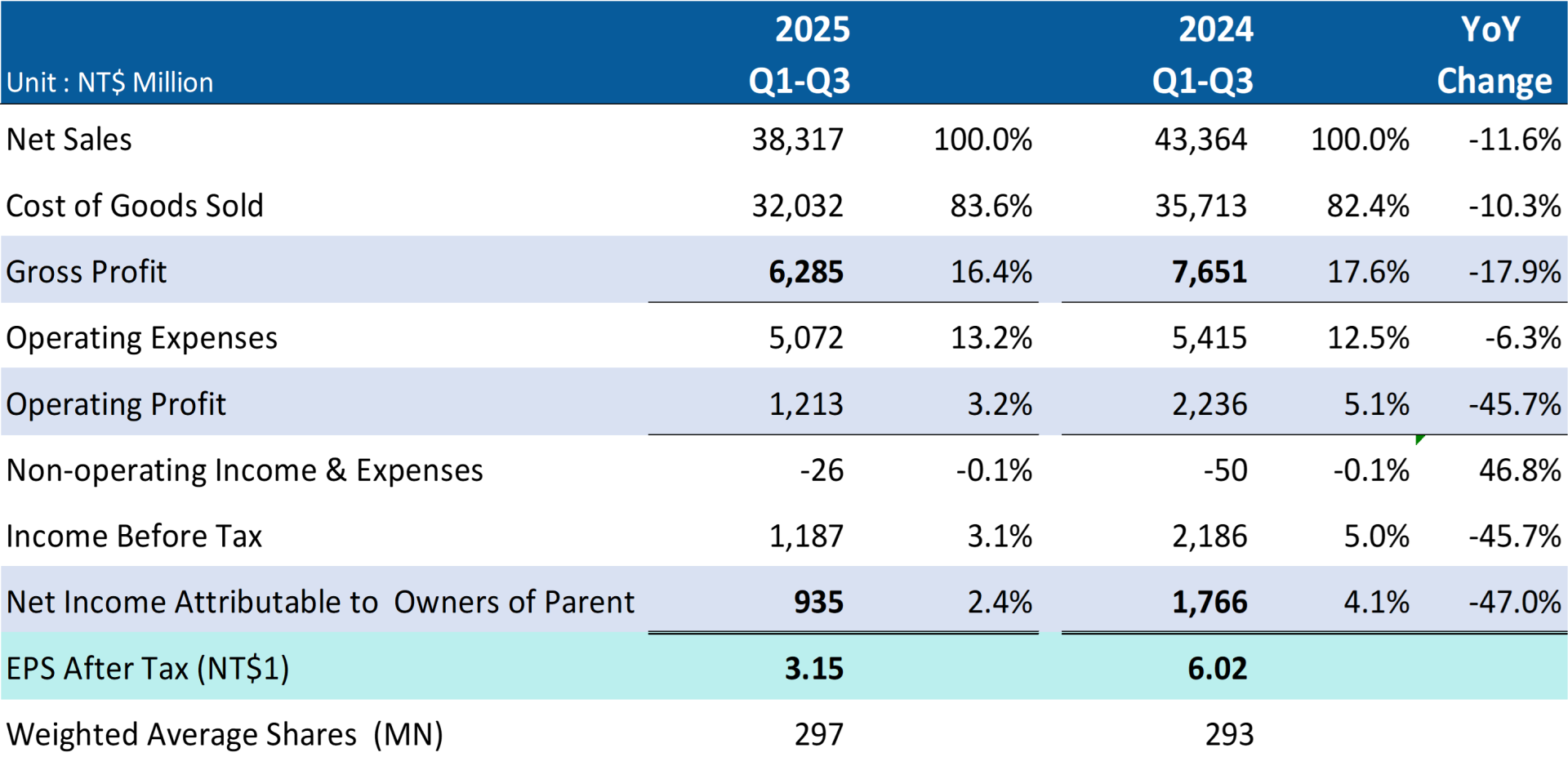 On consolidated basis, net sales for the first three quarters of the year 2025 were reported as NT$38.3 billion, which represents a 11.6 % year-over-year decrease over NT$43.4 billion for the first three quarters of the year 2024. Operating profit for the first three quarters of the year 2025 were NT$1,213.1 million, which represents a 45.7 % year-over-year decrease over NT$2,235.5 million for the first three quarters of the year 2024. Net income attributable to owners of parent for the first three quarters of the year 2025 were NT$935.2 million, which represents a 47 % decrease compared to NT$1,765.6 million for the same period of last year. Based on 297 million weighted average shares, earnings per share (EPS) for the first three quarters of the year 2025 were reported as NT$3.15.