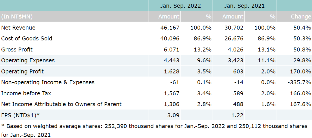 Consolidated net sales from January to September of year 2022 were reported as NT$46.2 billion, which represents a 50% increase over NT$30.7 billion for the first three quarters of 2021. Operating profit for the first three quarters of 2022 were NT$1.6 billion, which represents a 170% year-over-year increase over NT$603 million for the same period of last year. Net income attributable to owners of parent for first three quarters of 2022 were NT$1.3 billion, which also represents a 168% increase compared to NT$488 million for the same period of last year. Based on 252 million weighted average shares, EPS for the first three quarters of year 2022 were reported as NT$5.18.