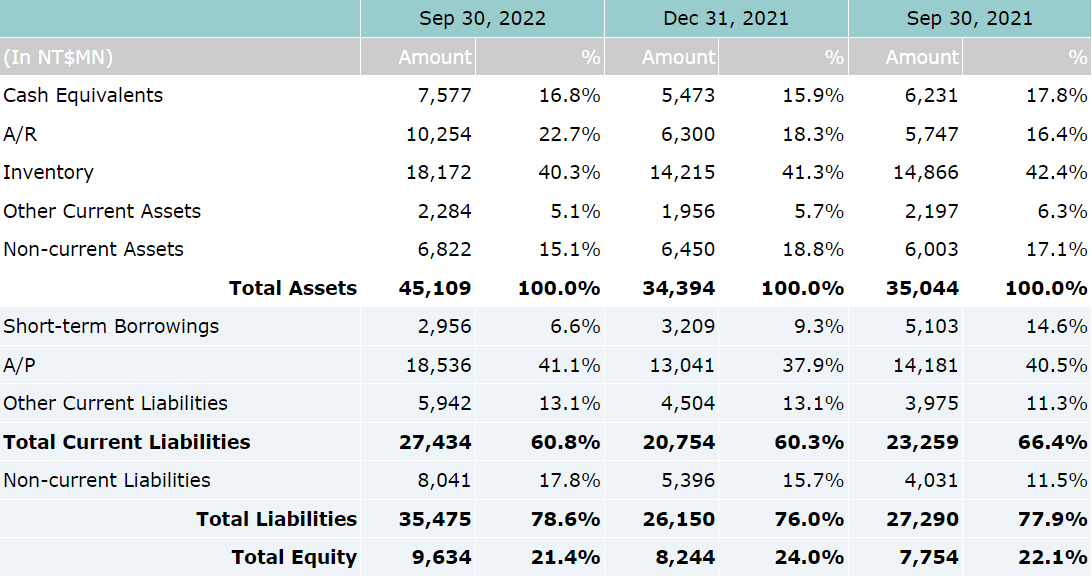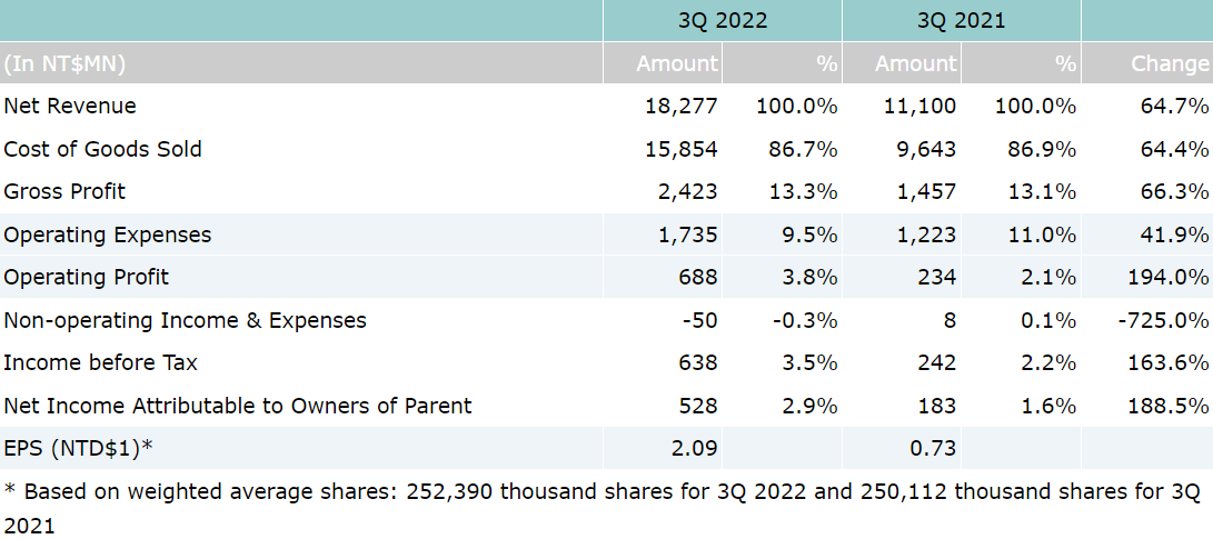 On consolidated basis, net sales for the third quarter of year 2022 were NT$18.3 billion, which represents a 65% year-over-year increase compared to NT$11.1 billion for 3Q’21. Operating profit for 3Q’22 were NT$688 million, which represents a 194% increase over NT$234 million for the third quarter of year 2021. Net income attributable to owners of parent for 3Q’22 were NT$528 million, which also represents a 189% increase compared to NT$183 million for the 3Q 2021. Based on 252 million weighted average shares, earnings per share (EPS) were reported as NT$2.09 for the 3rd quarter of year 2022.