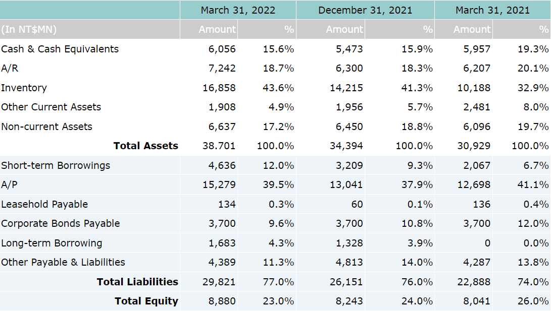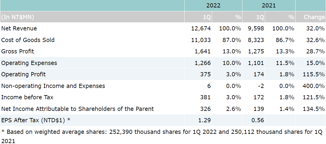 On consolidated basis, net revenue for the first quarter of year 2022 was NT$12.67 billion, which represents a 32% increase over NT$9.6 billion for 1Q'21. Operating profit for 1Q’22 was NT$375 million, which represents a 116% year-over-year increase compared to NT$174 million for the same period last year. Net income attributable to owners of the parent for 1Q’22 was NT$326 million, which also represents a 135% increase compared to NT$139 million for the 1Q 2021. Based on 252 million weighted average shares, earnings per share (EPS) was reported as NT$1.29 for the 1st quarter of 2022.
