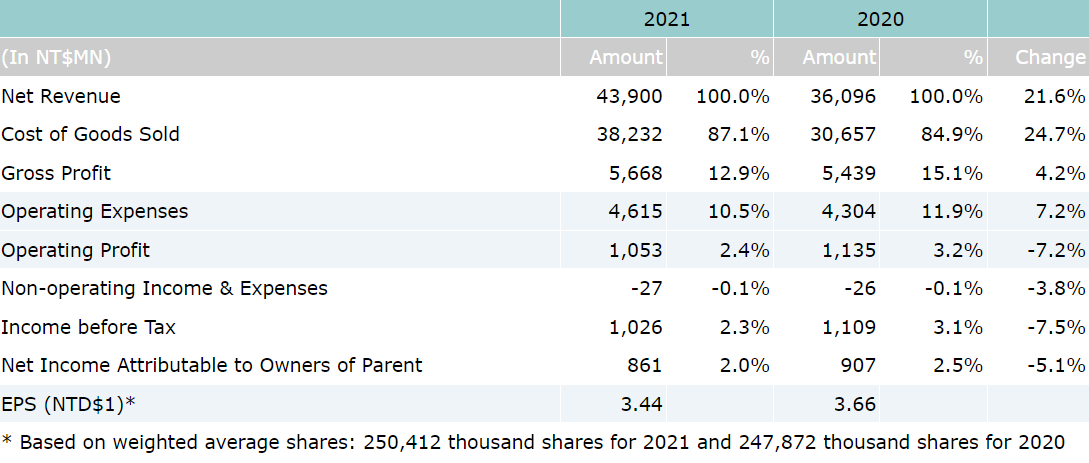 Consolidated net revenue for 2021 were reported as NT$43.9 billion, which represents a 22% increase over NT$36.1 billion for year 2020. Operating profit for 2021 were NT$1.05 billion, which represents a 7% year-over-year decrease over NT$1.14 billion for 2020. Net income attributable to owners of parent for 2021 were NT$861 million, which represents a 5% decrease compared to NT$907 million for 2020. Based on 250 million weighted average shares, earnings per share (EPS) for year 2021 was reported as NT$3.44.