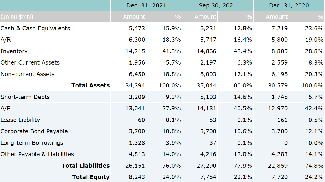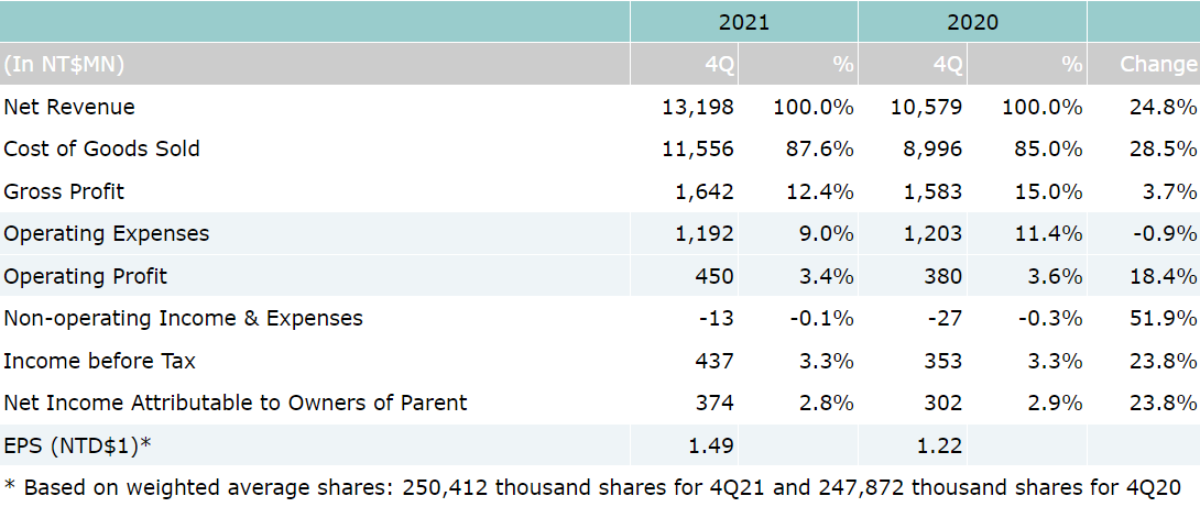 On consolidated basis, net revenue for the fourth quarter of year 2021 were NT$13.2 billion, which represents a 25% increase compared to NT$10.58 billion for the fourth quarter of year 2020. Operating profit for 4Q’21 was NT$450 million, which represents a 18% year-over-year increase over NT$380 million for 4Q’20. Net income attributable to owners of parent for 4Q’21 was NT$374 million, which represents a 24% increase compared to NT$302 million for 4Q’20. Based on 250 million weighted average shares, EPS was reported as NT$1.49 for the 4th quarter of year 2021.