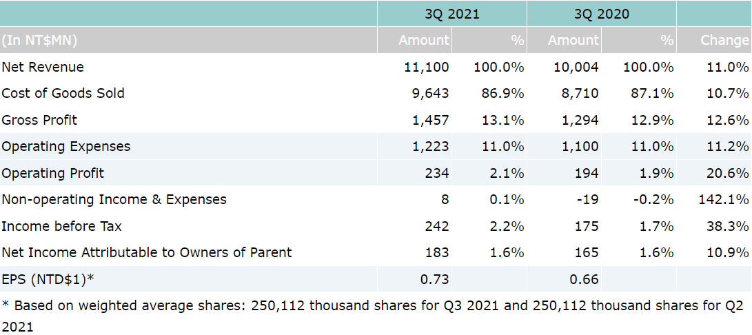 On consolidated basis, net sales for the third quarter of year 2021 were NT$11.1 billion, which represents an 11% quarter-over-quarter increase compared to NT$10 billion for 2Q’21. Operating profit for 3Q’21 were NT$234 million, which represents a 21% increase over NT$194 million for the second quarter of year 2021. Net income attributable to owners of parent for 3Q’21 were NT$183 million, which also represents an 11% increase compared to NT$165 million for the 2Q 2021. Based on 250 million weighted average shares, earnings per share (EPS) were reported as NT$0.73 for the 3rd quarter of year 2021.