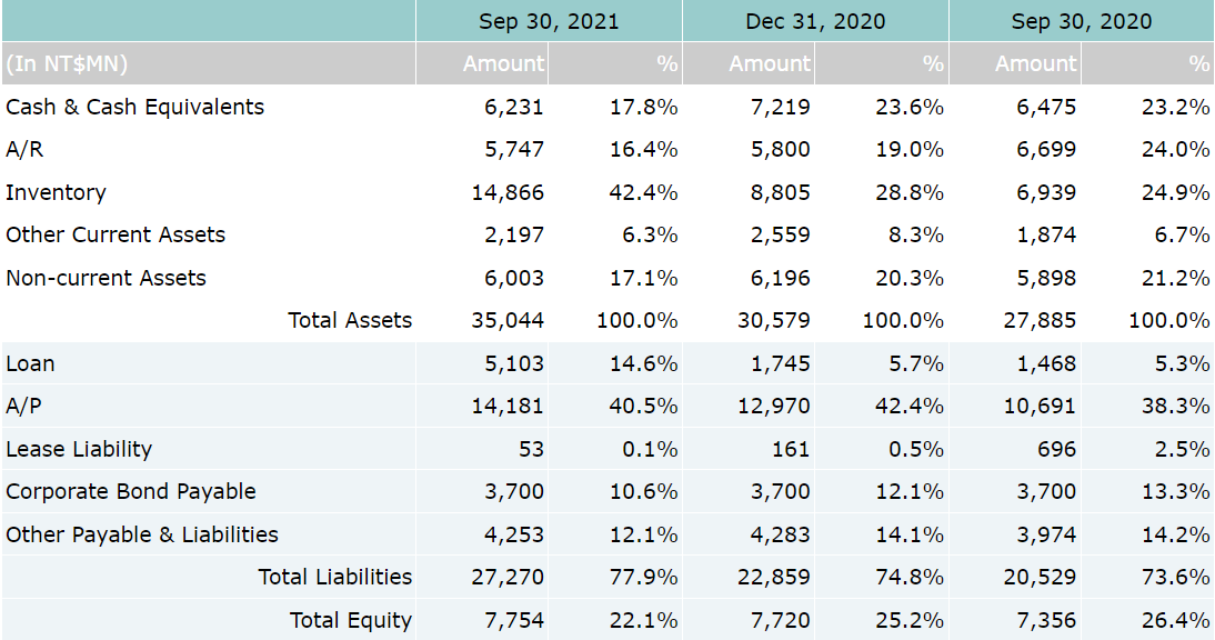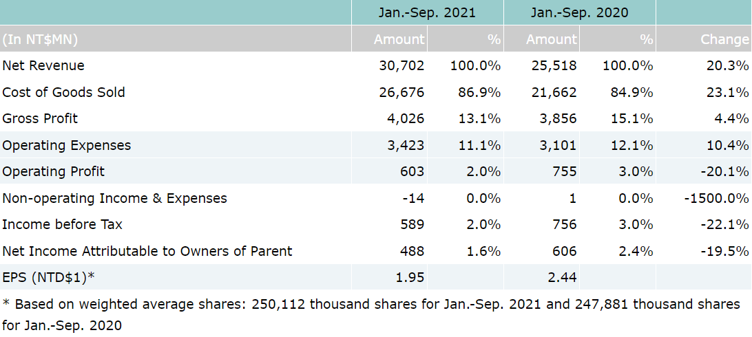 Consolidated net sales from January to September of year 2021 were reported as NT$30.7 billion, which represents a 20% increase over NT$25.5 billion for the first three quarters of 2021. Operating profit and net income attributable to owners of parent for the first three quarters of 2021 were NT$603 million and NT$488 million. Based on 250 million weighted average shares, EPS for the first three quarters of year 2021 were reported as NT$1.95.