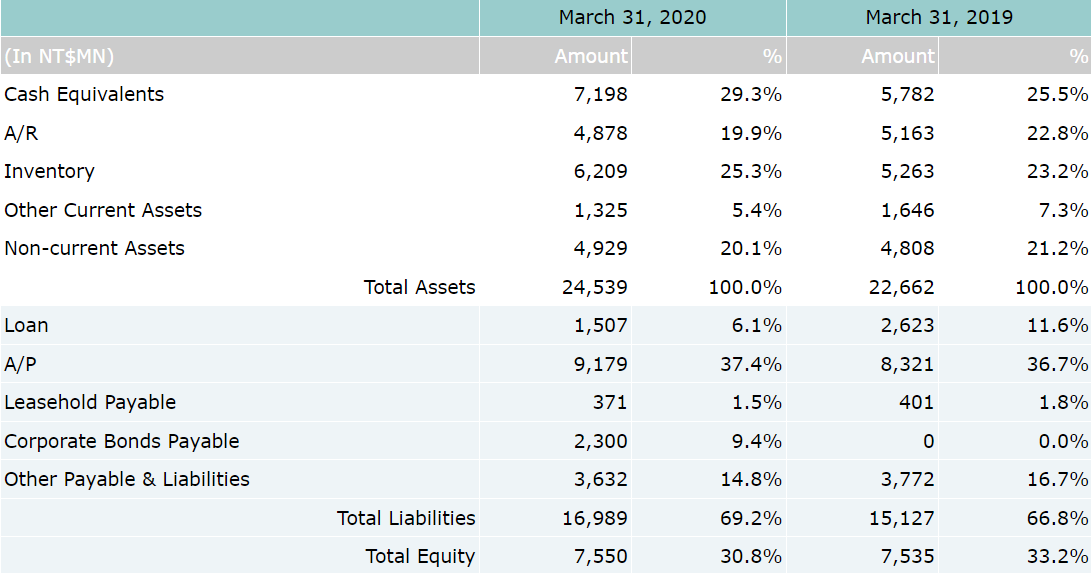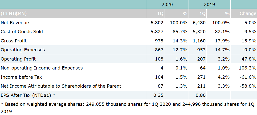 On consolidated basis, net sales for the first quarter of year 2020 was NT$6.8 billion, which represents a 5% increase over NT$6.48 billion for 1Q'19. Gross profit for the first quarter of 2020 was $975 million with 14.3% gross margin. Income before tax and net income attributable to shareholders of the parent for 1Q’20 were NT$104 million and NT$87 million, respectively. Based on 249 million weighted average shares, earnings per share (EPS) were reported as NT$0.35 for the 1st quarter of 2020.