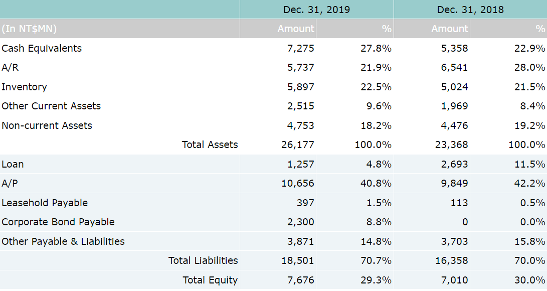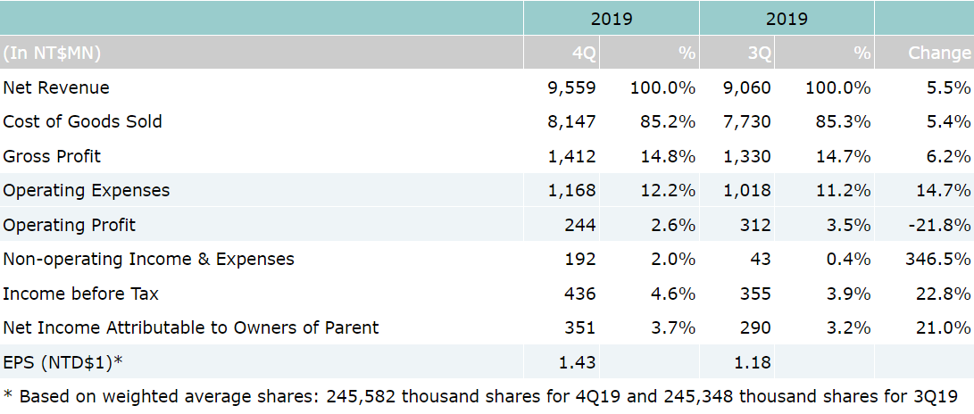 On consolidated basis, net sales for the fourth quarter of year 2019 were NT$9.56 billion, which represents a 6% increase compared to NT$9.06 billion for the third quarter of year 2019. Operating profit for 4Q’19 were NT$244 million, which represents a 22% quarter-over-quarter decrease over NT$312 million for 3Q’19. Net income attributable to owners of parent for 4Q’19 were NT$351 million, which also represents a 21% increase compared to NT$290 million for 3Q’19. Based on 246 million weighted average shares, EPS were reported as NT$1.43 for the 4th quarter of year 2019.