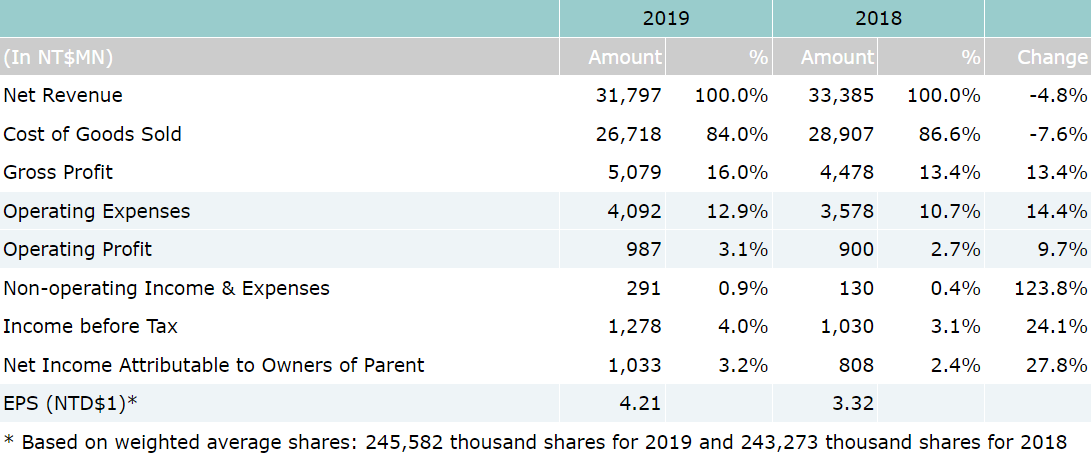 Consolidated net sales for 2019 were reported as NT$31.8 billion, which represents a 5% decrease over NT$33.39 billion for year 2018. Operating profit for 2019 were NT$987 million, which represents a 10% year-over-year increase over NT$900 million for 2018. Net income attributable to owners of parent for 2019 were NT$1.03 billion, which also represents a 28% increase compared to NT$808 million for 2018. Based on 246 million weighted average shares, earnings per share (EPS) for year 2019 were reported as NT$4.21.