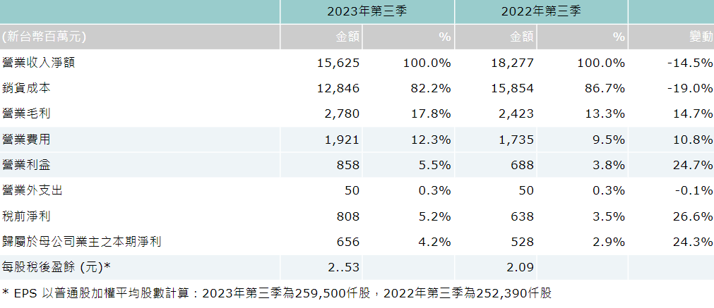 電信寬頻設備大廠中磊電子今(9)日公佈2023年第三季營運成果。中磊2023年第三季營收為156.3億元,較去年同期營收182.8億元、年減14.5%。單季營業利益達8.6億元,年成長25 %;歸屬母公司稅後淨利為6.6億元,年增率達24 %。以加權平均股數約260百萬股計算,第三季每股稅後盈餘(EPS)為2.53元。第三季獲利及EPS皆創公司同期新高紀錄。