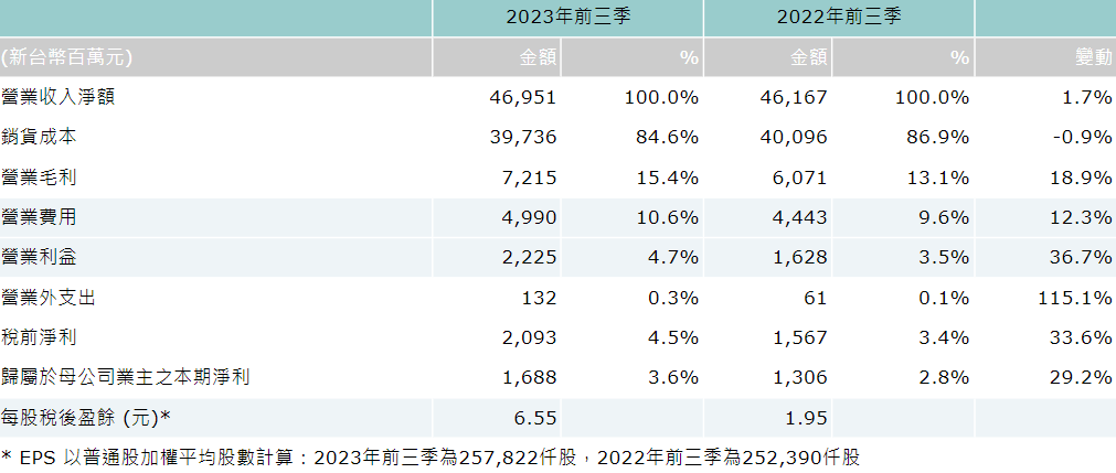 在累計營運部分,中磊2023年前三季合併營收為469.5億元,較去年同期營收461.7億元,年成長2 %。累計前三季營業利益為22.3億元,年增率達37%,前三季歸屬母公司稅後淨利為16.9億元,較去年同期成長29 %。以加權平均股數約258百萬股計算,累計前三季每股稅後盈餘(EPS)為6.55元。公司前三季累計稅後淨利及EPS皆創同期歷史新高紀錄。