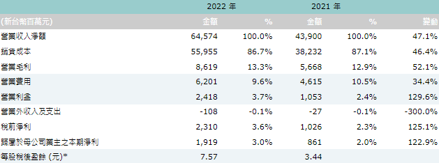 * EPS 以普通股加權平均股數計算: 2022年為253,558仟股,2021年為250,412仟股