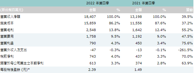 * EPS 以普通股加權平均股數計算:2022年第四季為253,558仟股,2021年第四季為250,412仟股