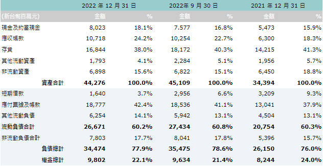 表 3:2022 年合併資產負債表