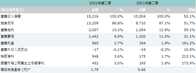 * EPS 以普通股加權平均股數計算:2022年第二季為252,390仟股,2021年第二季為250,112仟股