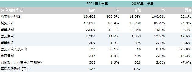 * EPS 以普通股加權平均股數計算:2021年上半年為250,112仟股,2020年上半年為248,293仟股