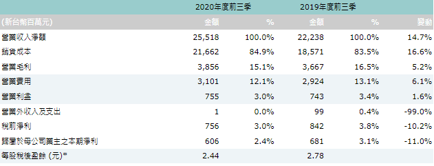 * EPS以普通股加權平均股數計算:2020年前三季為247,881仟股,2019年前三季為245,180仟股