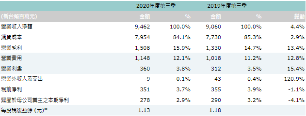 * EPS以普通股加權平均股數計算:2020年第三季為247,057仟股,2019年第三季為245,348仟股