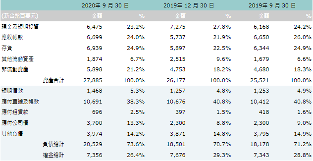 表 3:2020年度前三季合併資產負債表