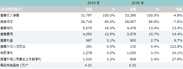 * EPS 以普通股加權平均股數計算: 2019年為245,582仟股,2018年為243,273仟股