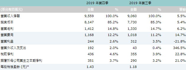 * EPS 以普通股加權平均股數計算: 2019年第四季為245,582仟股,2019年第三季為245,348仟股