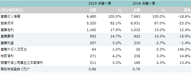 * EPS 以普通股加權平均股數計算:2019年第一季為244,996仟股,2018年第一季為245,654仟股