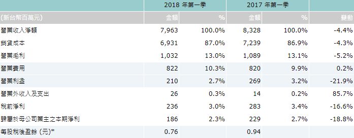 * EPS 以普通股加權平均股數計算:2018年第一季為245,654仟股,2017年第一季為242,920仟股