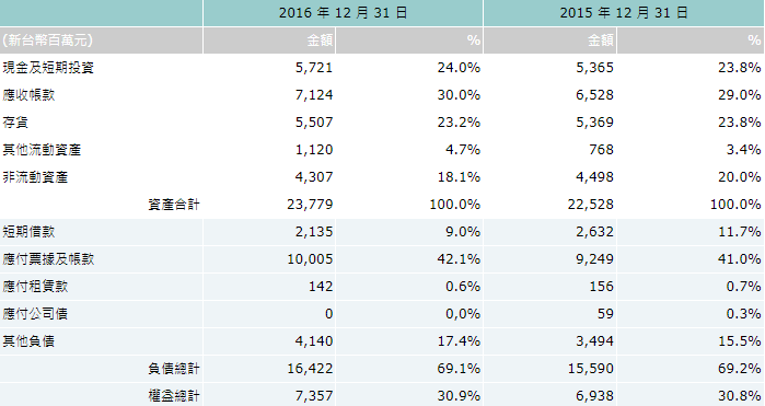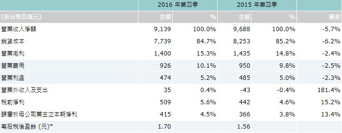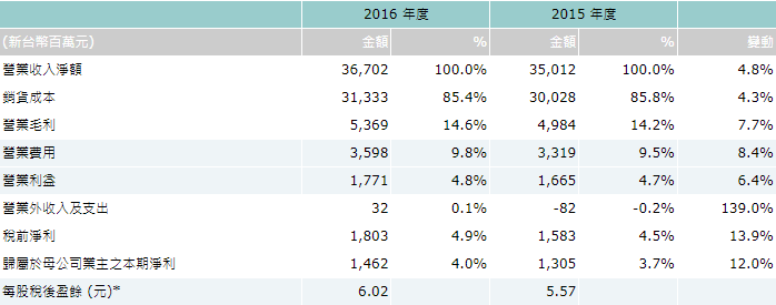 * EPS 以普通股加權平均股數計算:2016年為242,647仟股, 2015年為234,080仟股