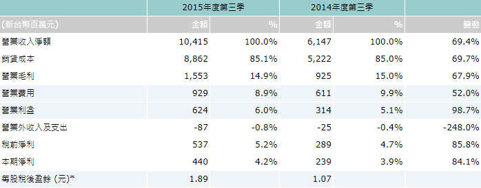 * EPS 以普通股加權平均股數計算:2015年第三季為233,901仟股,2014年第三季為223,983仟股